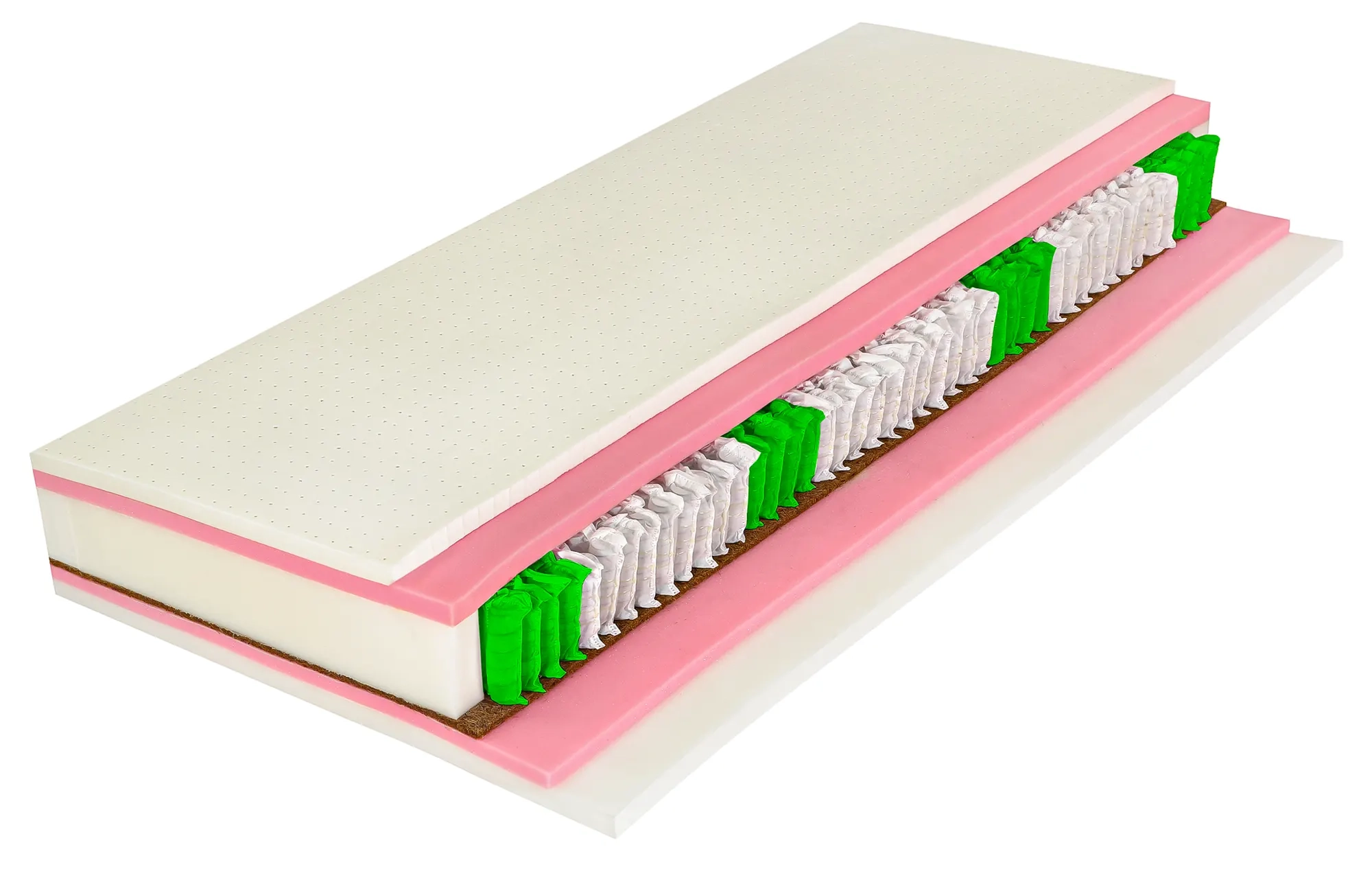 Tropico, taštičkové pružiny, Flexifoam® a latex, kokos, tuhosť 3/4 (rozsah 1-5), nosnosť 145 kg, výška 26 cm