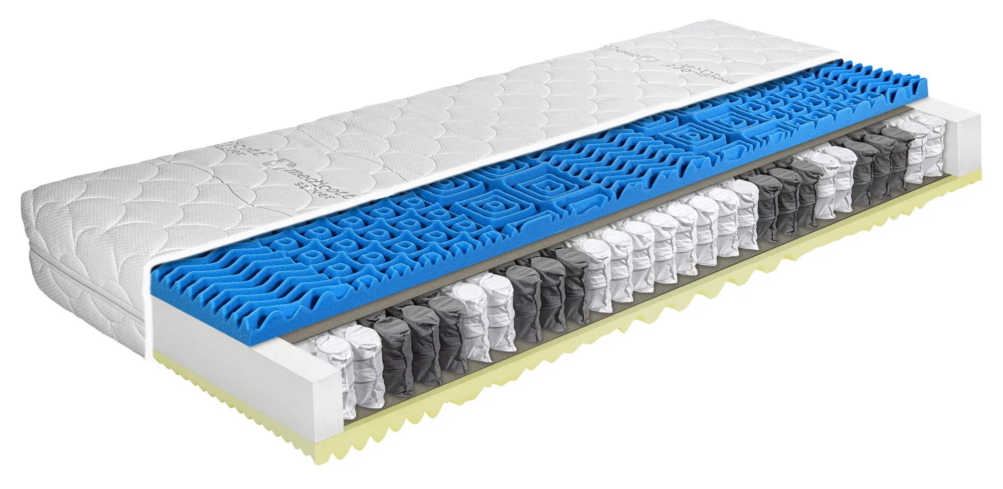 Viscosense, PUR pena, taštičkové pružiny, filc, tuhosť 3 (rozsah 1-5), nosnosť 130 kg, výška 20 cm